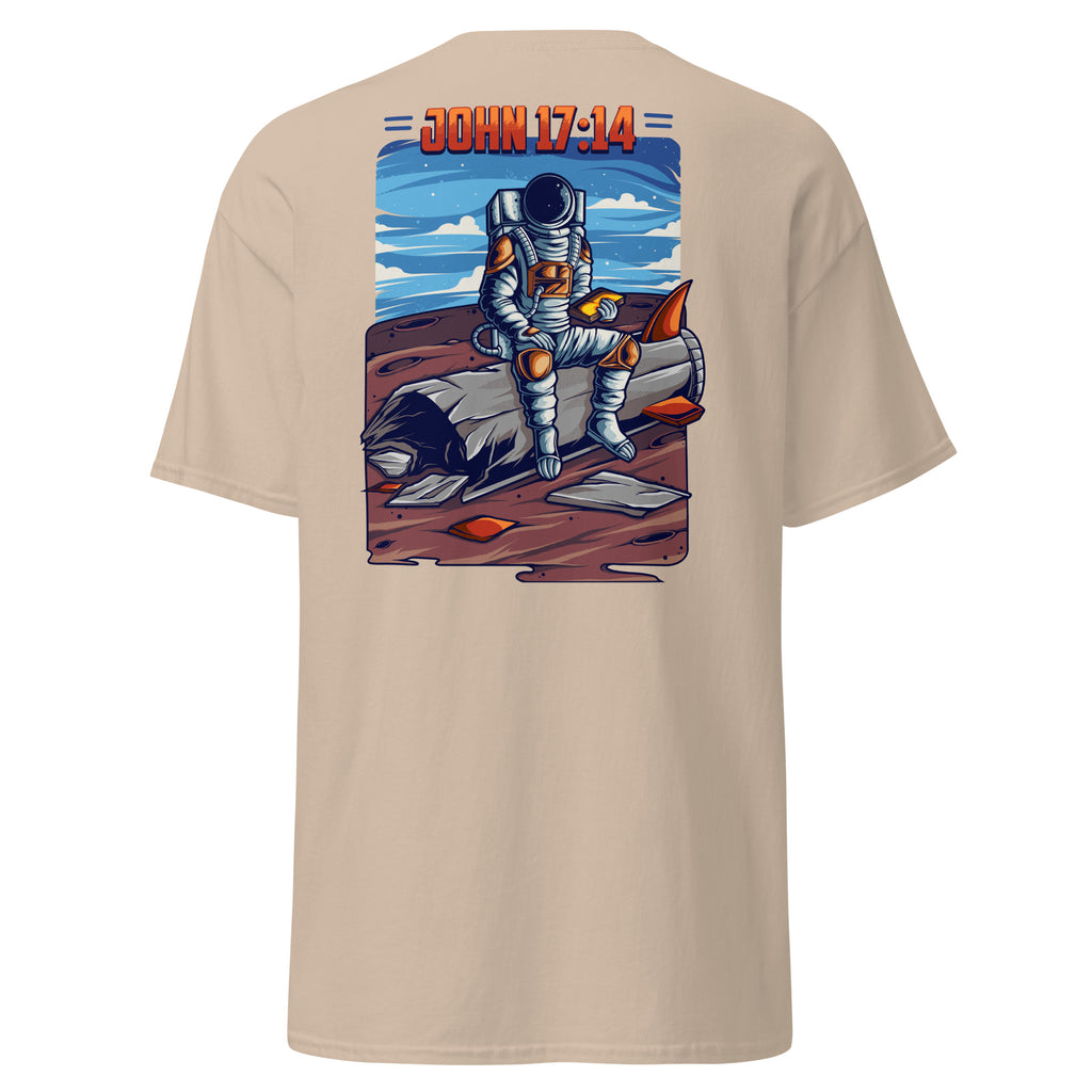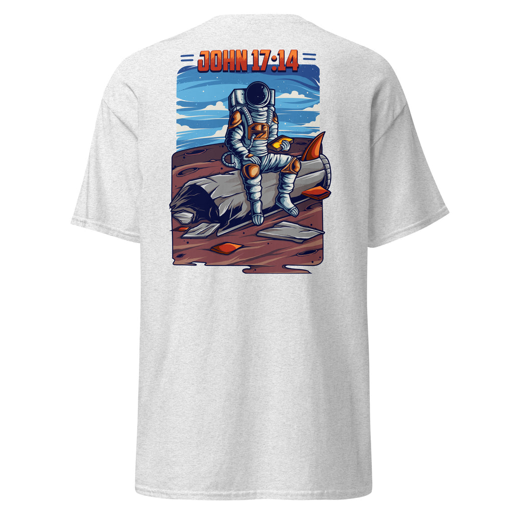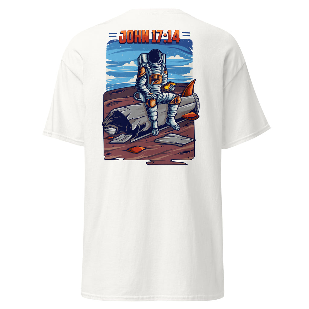 Faith with a cosmic twist. Featuring the verse "They are not of the world, just as I am not of the world" (John 17:14), this tee is more than just a statement—it's a mission.